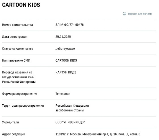 По данным rkn.gov.ru от 24.11.2025 по ИНН является учредителем (соучредителем) средств(а) массовой информации:
